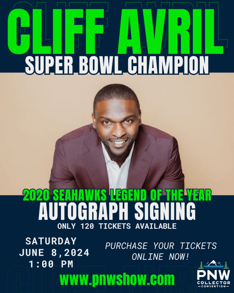 Seize the opportunity to meet the 2020 Seahawks’ “Legend of The Year” and Super Bowl Champion, Cliff Avril, at the 2024 PNW Collector Convention! Cliff Avril will grace the Three Rivers Convention Center with his presence for a special public autograph session on Saturday, June 8th, 2024, from 1pm to 2pm.